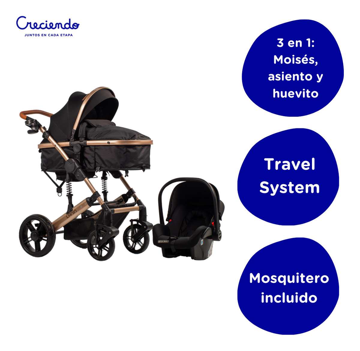 Cochecito de paseo travel system Mega Baby 3 en 1 Lanin Travel System negro con chasis color dorado